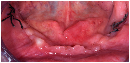 The patient was then given postoperative instructions, including the continuation of 0.2% chlorhexidine digluconate (Corsodyl, GlaxoSmithKline, Verona, Italy) mouth rinse twice a day for two weeks starting the day after surgery, painkillers if needed. Due to the absence of teeth/prostheses in the lower jaw, the patient was forced to eat liquid/soft food starting from the day after the surgery.
