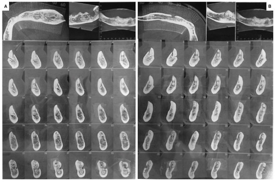 Cone Beam Computed Tomography acquired six months from the initial surgery (March 2022). (A) Left side; (B) right side.