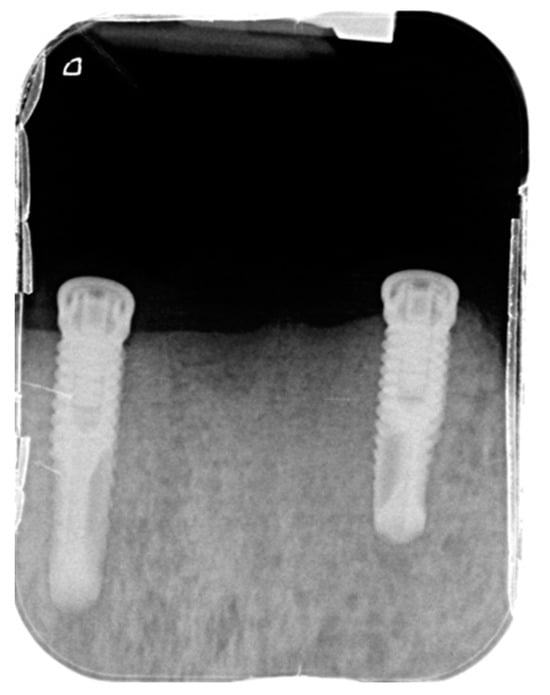 Two implants (Branemark System Mk III TiU RP 4 × 10 mm, Nobel Biocare, Viale Monza, 347, 20126 Milano, Italy) were inserted in February 2023 (Figure 9) following a two-stage technique.