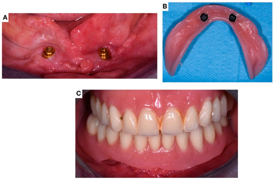 Images showing the delivery of the implant-supported prostheses (June 2022). (A) Clinical image of the locators connected to the implants; (B) Image of the modified prostheses with the attachment; (C) Clinical image after the prostheses delivering.