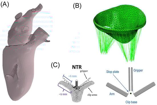 (A) geometric LHM of the left ventricle and left atrium; (B) mitral valve model showing the chordae apparatus; and (C) MitraClip and its model representation.