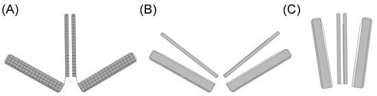 The geometric design of the clip device comprised four rigid plates, closely resembling the actual transcatheter MitraClip device developed by Abbott (Figure 1C). The dimensions were chosen to match the NTR version of the MitraClip, with the two arms having a width of 5 mm, length of 8 mm, and thickness of 1.5 mm. The gripper had a thickness of 0.7 mm. “Stop plates” were included in the model to limit the leaflet insertion length, similar to the actual clip device. The arms and grippers of the clip device were actuated to fully grasp the mitral valve leaflets along a single axis at a hinge point located at the base of the clip. To ensure the stiff behavior of the device, rigid material properties were assigned to both arms and grippers, and the material density was set to achieve a total mass of 0.67 g, in accordance with the manufacturer’s design specifications. A reference node was generated to anchor the clip device in place near the mitral valve leaflets (black dots in Figure 1C). To simulate the MitraClip procedure, both rotations and translations were implemented with respect to the reference node, utilizing kinematic couplings between the parts in the ABAQUS/Explicit solver (v2022, Dassault Systèmes, USA). All degrees of freedom of the clip device were constrained to the reference point. The simulation began with the arms opened to their reference configuration (Figure 2A). Subsequently, the grippers were rotated by 52 degrees, causing them to face the device arms (Figure 2B) and thus capturing the mitral valve leaflets. Finally, the clip device was closed by simultaneously rigidly rotating both grippers and arms by −52 degrees relative to the reference point (Figure 2C). Such rotation values were derived from manufacturer guidelines and the consideration that the face of the device should be made as parallel as possible.