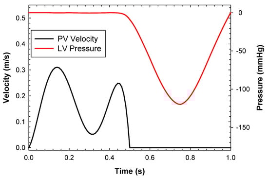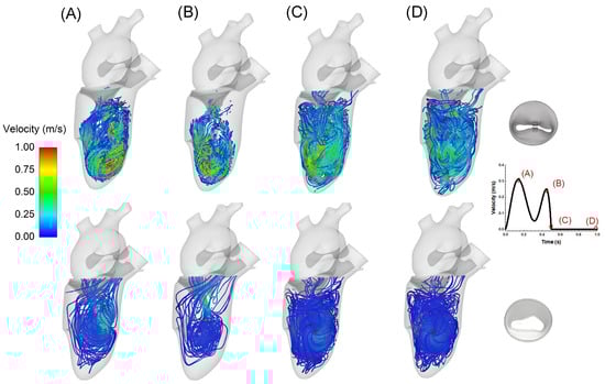 After simulating the MitraClip process, the deformed shapes of the left heart and clipped mitral valve were exported from ABAQUS as a stereolithographic file. To define the internal flow problem, the surface normal of each geometric part was oriented to point towards the interior domain of the left heart model. Blood was assumed to be a Newtonian and isothermal fluid, with a density of 1060 kg/m3, viscosity of 0.00371 Pa·s, and a temperature of 37 °C [33,34]. The turbulence model used was wall-adapting local eddy-viscosity (WALE). The flow simulation employed 749,220 unity D3Q27 lattices (74 × 74 × 135) with a high number of degrees of freedom per discrete element of fourth-order spatial discretization. A spatial length of 1 mm with a temporal resolution of 0.05 ms was chosen after a grid sensitivity study. Specifically, the peak velocity across the clipped mitral valve was monitored for four different grid refinements. No-slip boundaries were applied to the left ventricular and atrial walls. For the inlet, a flow velocity profile was set at each pulmonary vein and then split, assuming a proportionality of each pulmonary vein’s cross-sectional area and mass balance conservation. The outflow had a pressure outlet profile imposed at the aortic root of the left ventricle (Figure 3). Two cardiac beats with a period of 1 s were simulated to reduce instabilities related to transient flow, and the last cycle was used for flow analysis. In order to compare hemodynamic patterns, fluid dynamics were also conducted on the mitral valve in its fully opened shape under healthy conditions.