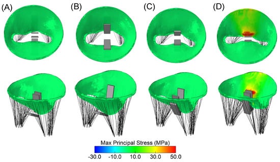 Structural analysis using maximum principal stress revealed local maxima at the location of the implanted clip device in the mitral valve model (Figure 4). Upon the closure of the gripper component (Figure 4B), no significant changes in stress distribution on the mitral valve leaflets were observed. However, when the clip device was fully closed (Figure 4C), the mitral valve leaflets began to stretch, resulting in a notable increase in stress magnitude. The anterior mitral valve leaflet exhibited the highest stress distribution compared to the posterior valve leaflet.