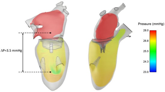 A pressure drop of 3.5 mmHg was found across the clipped mitral valve at diastole, as shown in Figure 6. This pressure drop was likely induced by the reduced orifice area of the clipped mitral valve, leading to an increase in left atrial blood pressure.
