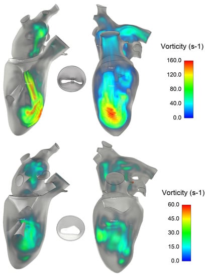 Analysis of the vortex in the fluid structure was performed using volumetric rendering of the vorticity parameter, defined as the modulus of the curl of fluid velocity (Figure 7). The residual mitral valve area led to the development of vortexes in the left ventricle, with pronounced flow curls primarily impinging the apical superior region of the left ventricle. The double orifice of the mitral valve exhibited a predominant vorticity structure on the left side of the MitraClip, indicating a potential hemodynamics impairment of the left ventricle.