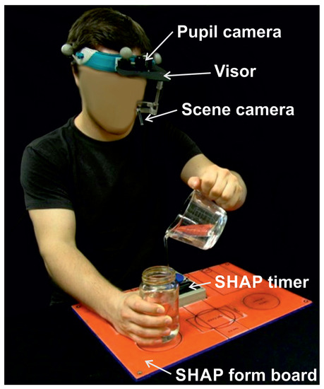 After the ethics processes were completed, each subject donned the ISCAN headset. Prior to the tests, the system was calibrated. Subjects were then asked to perform the six SHAP tasks (pouring water, coins, cutting, abstract lateral, page turning, operating a zip) (for details, please see [22,23]). Subjects then removed the eye-tracker headset and performed a SHAP test according to the standard protocol.