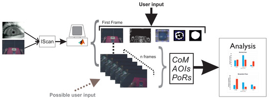 The video is a sequence of images or frames. The analysis was undertaken frame-by-frame, starting with the first image. The system identified and tracked the desired objects within each image. The code was not constructed to work without some human intervention. The software coordinated the identification of the key points of interest in the first frame by the operator and the computer tracked the movement through the visual field in subsequent frames using distinctive visual features. The software extracted the boundaries and coordinates of the AoIs from the videos captured. It used established image-processing techniques [29].