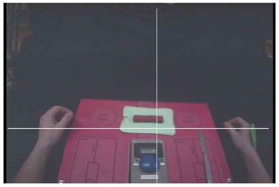 An example of the image created by the ISCAN system. The form board, subject’s hands, and the cross show where the subjects gaze is focused. The form board is set up for the cutting task. The object to be cut is in the top centre, the knife is to the right, and at centre bottom is the timer with the on/off switch in blue.