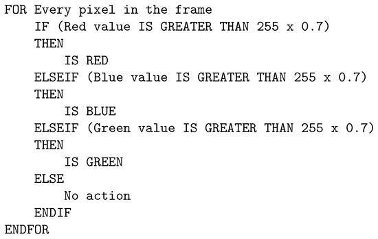 Generally, to analyse the videos generated, the experimenter has to step through the video frame-by-frame, identifying items of interest and inputting them into a computer for numerical analysis. This is laborious and time-consuming; it relies on human interpretation of the areas of interest (AoIs) in the scene and is dependent on the level of skill and attention of the observers [17]. Computer systems and image-processing software are now able to analyse complex video images through forms of machine learning [18,19]. However, to achieve an adequate level of proficiency to be useful [9], the systems require many examples of the test data to train the system. Studies with prosthesis users rarely generate enough data to train an advanced machine learning model sufficiently. The number of repetitions each subject would have to perform is unrealistic. This project created a system that did not require the computer system to be that competent or to require many examples to train the software. Instead, the software was designed to extract key items of interest from the video of the visual field, with the operator marking the first instance of an AoI and then the computer being able to track it in subsequent frames. The automatic identification was based on three details: the colour of the object, its shape, and that an object cannot have moved far between successive frames. This approach has not been used previously for this sort of application.