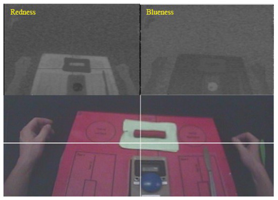 For this application, SHAP has the additional advantage of providing a framework that allows the computer system to make assumptions about the underlying structure of the tests. The form board holds the parts of the task in a fixed starting point. Each surface of the form board is a strong standardised colour (red for ADLs and blue for abstract objects). The timer button is in the centre and is blue surrounded by the grey of its case. This makes the prediction of where points of interest lie in the first frame and their extraction from a noisy video field easier. Thus, any computer-based search can start with these features assumed, e.g., colour, contrast and relative position in the visual field, and search for known shapes and colours in the most likely places.