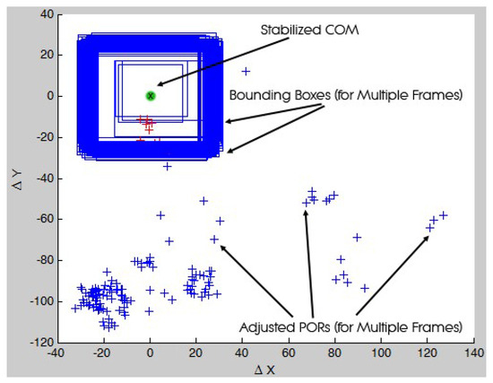 Relative PoRs to CoM coordinates for the cutting task for an unimpaired subject. The timer button is stabilised as the centre of mass and is at the origin. Note: Upper left. The multiple PoRs are then shown relative to it. The red crosses are when the attention is on the button.