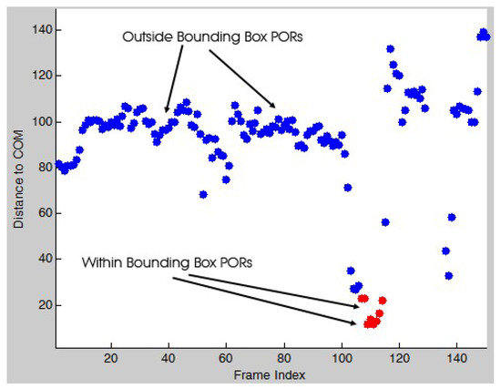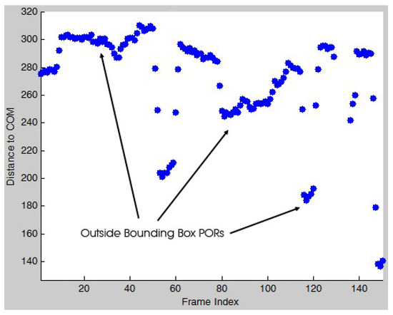 Figure 10 shows the time series of the same sequence. The horizontal axis is the frame number; hence, the time. The vertical axis is the distance from the blue button CoMs. Red circles mark the frames when the PoR was inside the bounding box of the reference object (fixating on the button). This is an analysis of 150 frames or approximately five seconds of recorded video. The subject looks at the button only once. Figure 11 shows the Euclidean distances between the PoR and the CoM of another tracked object within the scene (the knife). It can be seen that the PoR is never within the bounding box of the OI, so the subject never looks directly at the knife, but can see it in their peripheral vision only.