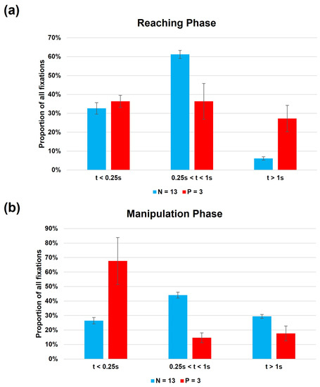 Number of fixations for the cutting task divided into three phases: Below 0.25 s, between 0.25 and 1 s, and greater than one second. (a) Data for reaching phase, and (b) the manipulation phase. Error bars are standard deviation across subjects.