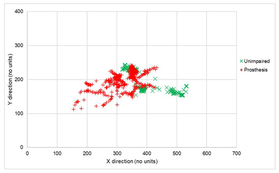 The range PoR across the visual field for the unimpaired arm and the prosthesis. Values are dimensionless numbers from the digitisation of the visual image. Green crosses are for an unimpaired hand, red are for a prosthesis.