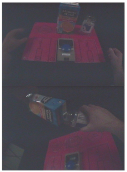 Finally, the point of view of the subject provides clues as to how they compensate for the lack of flexibility in some of the joints in their prosthesis. Users of prosthetic limbs tend to compensate for the lack of flexibility in the wrist and forearm by using a combination of humeral abduction and trunk sway instead of flexion/extension and pro-supination [39]. This motion tends to cause the visual field to rotate. This is clear in a comparison of frames during the pouring task in Figure 14. The first example is an early frame and the second is taken during the pour, showing considerable rotation of the body to the right in compensation.