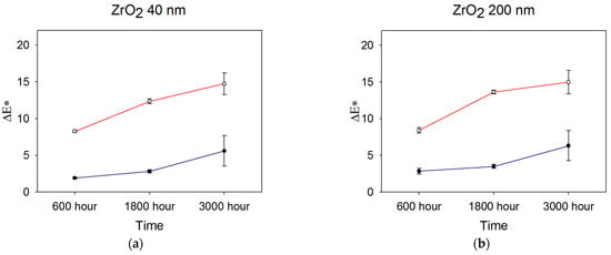 Color measurements obtained after 600, 1800, and 3000 h were used to determine color differences with baseline measurements, and ΔEab was calculated from Equation (1). Figure 2 shows ΔEab color changes over time for the ZrO2-, TiO2-, and SiO2-filled materials.