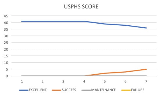 All 41 patients (100%) showed “excellence” USPHS ratings between the first and fourth years after rehabilitation. In the fifth year of observation, two USPHS criteria changed for surface roughness; so, globally, the USPHS score was “excellence” in 39 cases (95.1%), with only 2 (4.9%) considered as “success”. In the sixth year, one more adversity was added to a patient as showing surface roughness classified as “b”; thus, globally, 38 cases (92.7%) were “excellent” and 3 (7.3%) were “success” after 6 years of observation. During the last (seventh) year, two other patients were classified with “b”, precisely one for increased surface roughness and one for a minor color mismatch. Finally, the USPHS score was “excellent” in 36 (87.8%) cases and “success” in 5 (12.2%) at the seventh year of clinical evaluation. The trend of the USPHS score is reported in Figure 1.