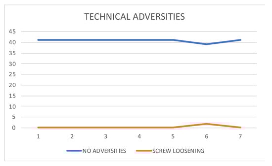 Different technical adversities were reported over seven years: screw loosenings in three patients at 64, 70, and 76 months, which were tightened. Moreover, four composites filling opposite teeth were fractured and reconstructed adequately with a composite overlay. Overall, no catastrophic complications were registered (Figure 2).