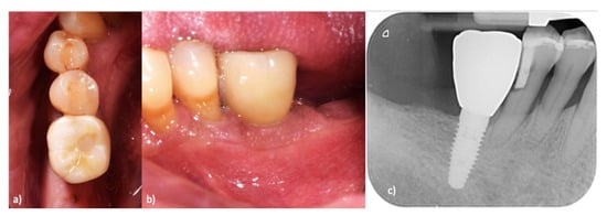 Single-crown monolithic zirconia, screwed-on implant, for replacement of a missing first inferior molar: (a) occlusal view; (b) lateral view; (c) radiological appearance after 7 years.