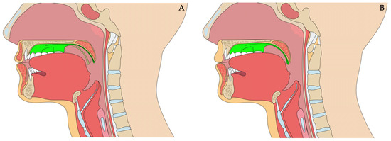 Placement of the pharyngeal obturator: (A) passive appliance and (B) pharyngeal bulb activated, which allows the palatopharyngeal sphincter to close but also restores defects in the soft palate. Image created with biorender.com (accessed on 13 October 2023).