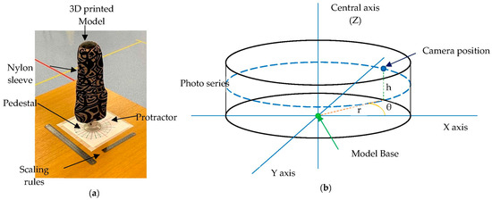 The 3D printed control model (physical twin) was mounted onto a pedestal and covered in a patterned nylon sleeve, as in the previous scan. The sleeve exhibited a different pattern, but used the same colours. A 30 cm and a 15 cm metal ruler were placed next to the model for scaling. A printed protractor was placed under the model to indicate 15° increments. A total of 288 photos were captured of the 3D model, using the points designated by Table 1, at 15° increments (θ) based on a cylindrical coordinate system. Camera positions were controlled using a tripod for vertical height and ruler for radial distance. The angular position of the camera was aligned visually with the marks on the protractor at the model base. A visual representation of the experimental setup and the location of the photos is shown in Figure 2.