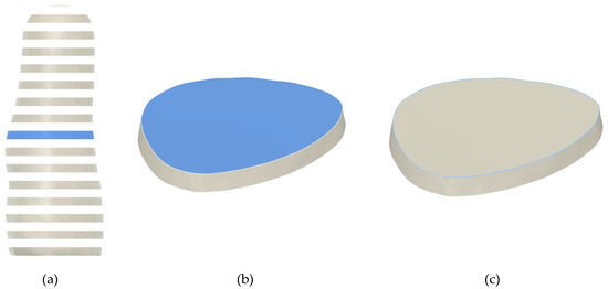 Visualisation of comparative metrics: (a) the scan model, with alternate segments hidden and a single segment highlighted in blue; (b) a single segment, with the top surface highlighted; (c) a loop length of the same segment.