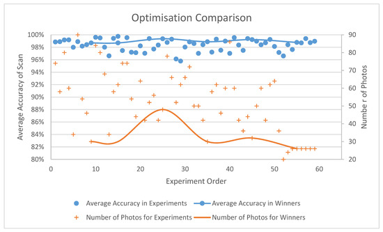While the optimisation process led to overall improvements in the accuracy and simplicity of the photogrammetry technique, the average scan accuracy was ~97%. Therefore, it was difficult for the fitness equation to reward increases in accuracy, as the percentage difference between experiments was minimal. This explains why there is a fluctuation in the optimisation scores after generation three, as the reduction in photos produces larger differences than do the changes in accuracy. Unfortunately, due to the manual input requirements of the photogrammetry software, it was not possible to test additional generations, nor to test the impact of different fitness equations or SGA parameters.