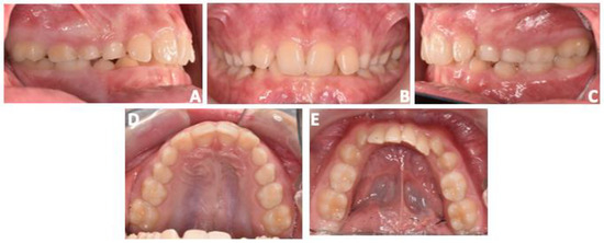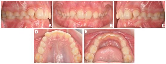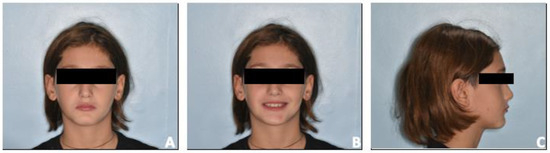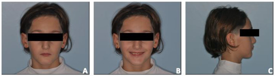 The present case report describes the treatment plan of an 11-year-old male referred for orthodontic consultation at the Department of Orthodontics of Catania University. In the frontal view, the patient exhibited facial symmetry, a significant increment of the lower face third, and no gingival exposure while smiling (Figure 1A,B).