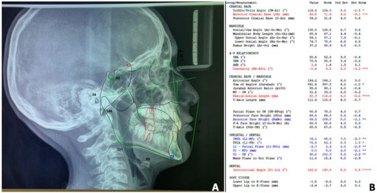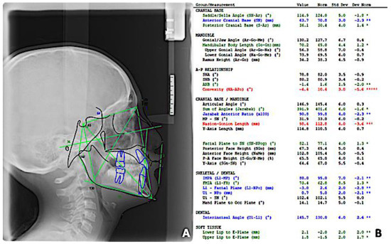 Pre-treatment cephalometric analysis. (A) Cephalometric tracing, (B) cephalometric parameters(°: angular measurements, mm: millimetric measurements, %: ratio).