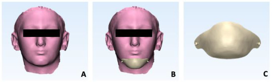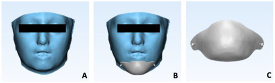 Since the patient required CBCT acquisition for oro-facial surgery evaluation, we had the possibility to use CBCT acquisition to generate a second CBCT-based chin cup for the same patient. A CBCT scan was conducted using ICAT (Imaging Sciences International, Hartfield, PA, USA) and subsequently converted into a Digital Imaging and Communications in Medicine (DICOM) file. The scanning protocol employed featured isotropic voxels measuring 0.3 mm in size, an acquisition time of 8.9 s, a wide field of view of 120 kV, and a current of 20 mA. Subsequently, utilizing Mimics 21.0 software (Materialise, Leuven, Belgium), the segmentation of the facial soft tissue was executed, and the resulting data were exported in .stl file format (Figure 6A). This 3D model of the facial soft tissue was imported into the 3Shape Appliance Designer software for the purpose of designing a customized chin cup with a thickness of 3 mm (Figure 6B,C). The designed chin cup was subsequently generated through 3D printing, using the same materials and settings as the FS-CC.
