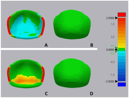 Deviation analysis. (A) Frontal view of stereolithography-based CC, (B) posterior view stereolithography-based CC, (C) frontal view of CBCT-based CC, (D) posterior view of CBCT-based CC.