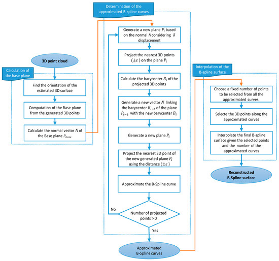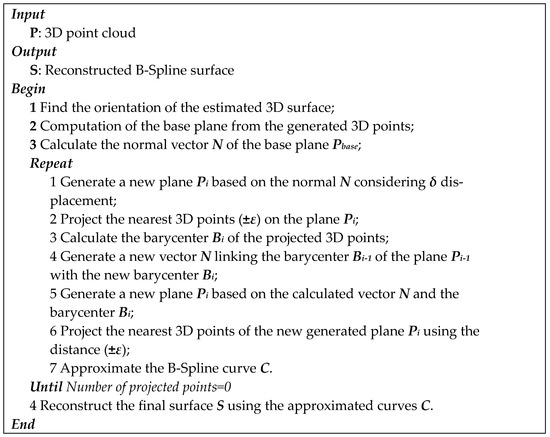 Figure 2 represents a flowchart of the overall approach. The general algorithm (Figure 3) consists of three general steps: calculate the base plane, determine the approximated B-Spline curves, and interpolate the B-Spline surface. In the following sub-sections, each step is detailed.