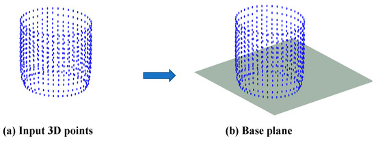 Firstly, the orientation of the 3D surface is estimated using the inertia matrix of the input 3D points. Given a set of unorganized points for , the coordinates of the centroid of the input 3D points are given by Equation (1).