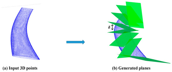 This step aims to approximate a set of B-Spline curves to be used in the surface reconstruction. Given the normal vector of the base plane, a plane is generated considering the -displacement value. Then, the nearest 3D points to considering the distance are projected on the generated plane . From these projected points, a barycenter is calculated to generate a vector linking this barycenter with the barycenter . A new plane is generated based on the calculated vector and the barycenter (Figure 5). Next, the nearest 3D points to the newly generated plane are projected on this plane considering the distance . From these projected points, a B-Spline curve is approximated. This process is repeated until there are no more points to project on the last generated plane. The generation of the projected planes in the 3D surface reconstruction process are necessary for planar fitting, surface segmentation, surface reconstruction, and geometric representation. These planes provide valuable information and serve as a foundation for further processing and refinement in the reconstruction pipeline.