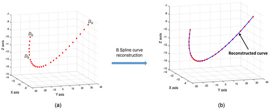 The B-Spline curve C is defined by Equation (10), given a set of input data points , a degree and a number (. The B-Spline curve of the degree defined by control points should be reconstructed according two conditions: The curve passes through the first and last data points, i.e., and = = , and the 3D data points are approximated by solving the least-squares problem.