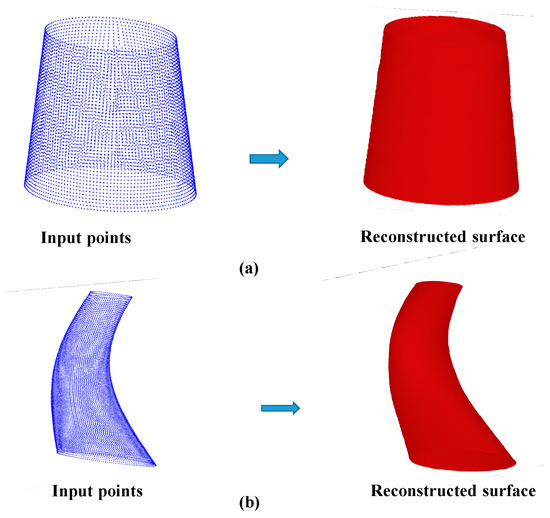 The reconstruction cases consist of two data clouds containing 6294 and 6365 points, respectively. Figure 7 presents the reconstruction results using the proposed method. The MRMS errors of the two reconstructed surfaces are mentioned in (Table 2). The reconstruction quality is acceptable as compared to the 700 × 10−6 mm root mean square error resulting from the reconstruction of regular feature models in [26].