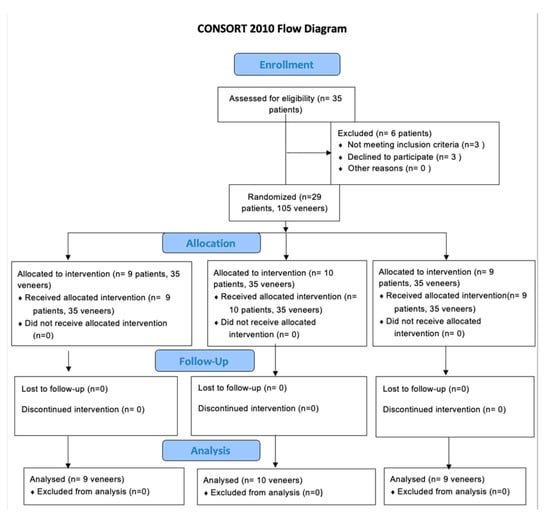 Laminate veneers were realized on 29 patients for a total of 105 restorations equally distributed in the three groups between September 2021 and December 2021 and included in the present study. All patients were informed about the scope of the trial and provided their written consent. The study protocol was approved by the Ethical Committee of University of Siena (clinicaltrial.gov #CT01932049). Also, the clinical treatment was performed in accordance with the ethical standards of the Institutional and National Research Committee and with the Declaration of Helsinki of 1964 and its later amendments or comparable ethical standards. This study adhered to the CONSORT guidelines (as reported in Table S1). Patients enrolled in the present clinical trial were referred to the Prosthodontic Department of the University of Siena asking for the esthetic and functional rehabilitation of teeth in the esthetic area. Patients were recruited according to the following inclusion and exclusion criteria: