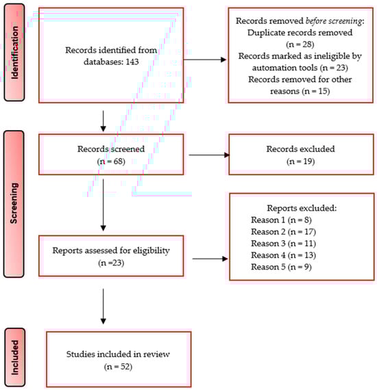 The initial search process identified 143 articles based on their titles across the 4 selected databases, published between 2019 and 2023. Following the removal of duplicate entries, 68 unique studies remained. Upon abstract review, 23 articles were excluded due to inadequate data or differing study methodologies. Consequently, 52 full-text articles met the inclusion criteria for this systematic review. Figure 1, depicted in the PRISMA flow chart, visually outlines the study selection process, from initial article identification to final study inclusion. This graphical representation offers a concise overview of the study selection trajectory. Notably, within the scientific dental literature using the specified keywords, no data were found concerning critical aspects of bioprinted bone graft development, particularly in the realms of vascularization and immune response. To comprehensively address these aspects, an additional component has been incorporated into this review.
