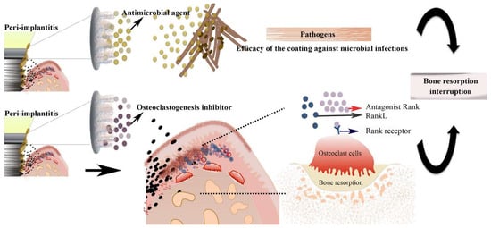 In the realm of peri-implantitis prevention, researchers have delved into implant coating strategies. Hydrogels have been employed as coatings on implant surfaces to deter bacterial colonization without provoking inflammatory responses. For instance, when hydrogels were applied as coatings on titanium implants, whether unloaded or loaded with 2% vancomycin, no significant effects on bone apposition volume or timing in the vicinity of the implant site were observed. Notably, these coatings did not incite any inflammatory reactions in vivo [31]. Moreover, Min et al. demonstrated the development of a self-assembled, polymer-based conformal coating using a water-based layer-by-layer (LbL) approach. This coating serves a dual purpose as a biomimetic implant surface, providing controlled and sustained release of antibiotics followed by active release of growth factors for orthopedic implant applications. This multilayered coating comprises two components: a base osteoinductive portion containing bone morphogenetic protein-2 (rhBMP-2) and an antibacterial component containing gentamicin [32]. Physicochemical modifications of dental implants have been explored as a means to mitigate the adhesion of microorganisms, although complete prevention of peri-implantitis may not be achievable through these measures alone. Biomaterials have been utilized as carrier coatings for antimicrobial agents, supporting both the prevention and treatment of peri-implant mucositis and peri-implantitis. A layer-by-layer (LbL) hydrogel coating operates on the basis of electrostatic interactions between polyelectrolytes possessing opposing charges. This design enables the controlled release of antibacterial substances in response to the acidic environment generated by bacterial metabolic processes in peri-implantitis, Figure 2 [33].