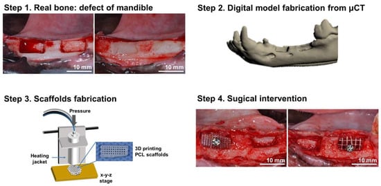 Schematic illustration of the preparation of 3D-printed PCL scaffolds for alveolar bone augmentation in a beagle defect model [69].