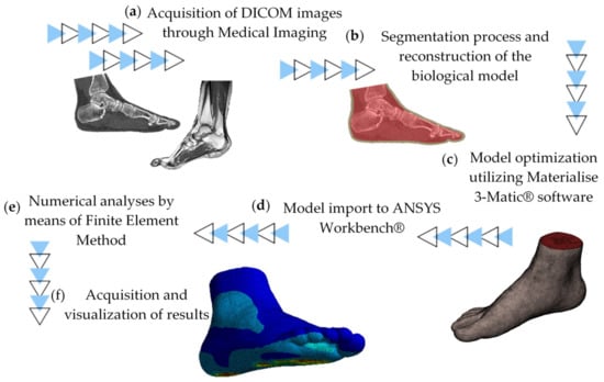 3D foot biomodel reconstruction and analysis methods. (a) Medical imaging study. (b) Segmentation process. (c) Model optimization process. (d) Model optimization process. (e) Numerical analyses. (f) Analysis and interpretation of results.