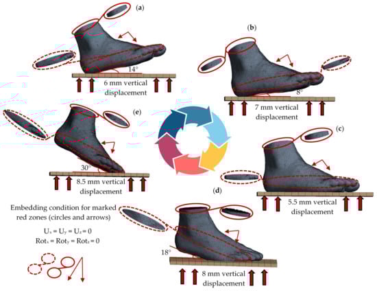 As an external agent, the rigid plate was set to apply a vertical displacement that simulates the effects of ground reaction forces on the plantar surface. According to the medical-experimental literature, it is recorded that between 1–2 mm of additional displacement is generated in the skin of the foot sole according to the degree of dorsiflexion and plantar flexion [66]. On the other hand, another study showed a similar displacement of 1–3 mm in the forefoot in the dorsiflexion of the toes during the pre-swing phase [67]. Even in different investigations, ranges between 6 and 10 mm were used as indentation elements on the forefoot side to evaluate the heel response [68]; a range between 10 and 14 mm [69] was also tested. Using ultrasound and ultrasound scans, stretching on the skin of the sole up to 10 mm was appreciated in the areas of contact of the foot with the ground during walking [70]. Therefore, according to these considerations from experimental literature, vertical displacements between 5.5 and 8.5 mm were applied for the respective stance phases. Once the parameters necessary to determine the application of the external agent for each stance phase were analyzed, a vertical displacement of 6 mm was used to simulate the effects of the ground reaction forces. Likewise, the position and orientation of the foot in that phase obtained from the experimental analysis were used. Figure 2a represents the loading and boundary conditions for which the numerical solution was developed for the heel strike stance phase. The same constraints were used to assign boundary conditions for the loading response stage; a vertical displacement of 7 mm was implemented to analyze this stance phase (Figure 2b). A vertical displacement of 5.5 mm was employed as an external agent for the mid-stance position (Figure 2c). The assignment for the external agent corresponds to a vertical displacement of 8 mm to analyze the heel rise phase. Likewise, the constraints previously used were also considered (Figure 2d). To simulate the pre-swing phase, which is where most plantar pressure is generated, a vertical displacement of 8.5 mm was applied (Figure 2e). Furthermore, a coefficient of friction of 0.6 between the foot and ground was included, complementing loading and boundary conditions parameters [71].