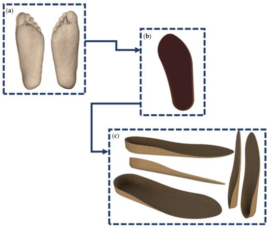 Workflow of the design process of a patient-specific 3D-printable foot orthosis. (a) Foot morphology’s mold. (b) Insole base. (c) Personalized 3D-printable insole.