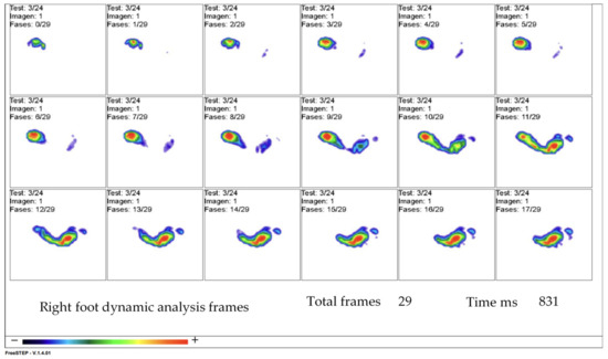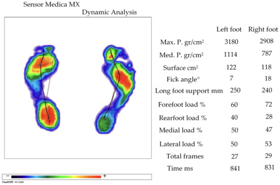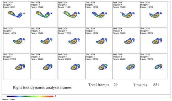 The results and general clinical assessments of the experimental analysis are shown in Figure 4. This result provided a general idea of the behavior and distribution of plantar pressure under typical conditions in the transition of stance phases during the gait cycle. Despite tending to relapse and stance mainly on the left foot, the behavior of the right foot is completely normal. Significant support in the forefoot area over the rearfoot (about 72 and 28%, respectively) was exhibited, which physiologically is considered minimally abnormal; however, this is not detrimental to its performance. Thus, it was obtained that a higher percentage of the total load is concentrated in the forefoot area, mainly in the central part over the second and third metatarsal heads, about 27.12%. This percentage was followed by a concentration of 17.12% on the fourth and fifth metatarsal heads, and finally, 10.65% on the first head.
