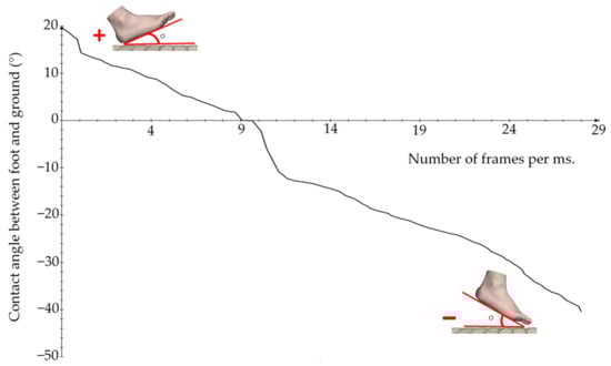 Based on the contact phases recorded in the baropodometric study, a graph was made between the information collected by the software and the contact area of the plantar zone concerning the frame recorded to determine the precise contact angle between the foot and the ground (Figure 7). The relationship between the contact between the rearfoot and the ground was taken with a positive angle as it was the beginning of the registration during gait. Therefore, the first stance phase (heel strike) was recorded in the second frame (frame 1) with an angle of 14°, and the loading response phase had an angle of 8° and was recorded in frame number 5. The mid-stance phase was recorded in frame 10, where the angle was 0°, and the foot was fully supported on the ground. As soon as the forefoot area connected with the ground, the angle was assumed to have a minus value since it passed through a 0 and acquired values with the opposite sign. Heel rise had an angle with the ground of −18° and was recorded in frame 17. Finally, the pre-swing phase was presented in the 25th frame with an angle of −30°. Negative-valued angles are only for reference, considering that the recording of the contacts began in the rearfoot area and ended with the forefoot at the tip of the hallux.