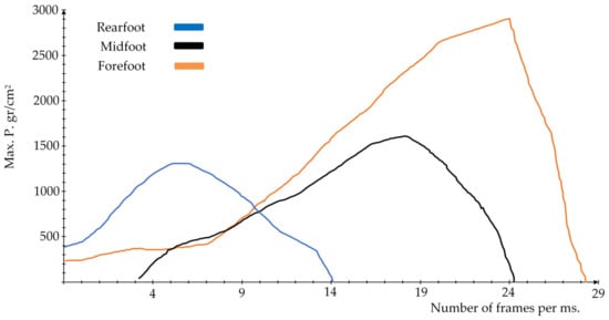 The gait experimental testing results were graphed according to the total number of frames taken and the maximum plantar pressure values exerted for each one of the stance phases. Figure 8 shows the results and specific behavior of the three crucial plantar regions: forefoot, midfoot, and rearfoot. The maximum pressure measurement was initiated by analyzing the rearfoot region from the heel strike phase to the pre-swing phase in the forefoot and toes region.