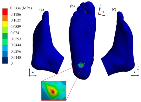 von Mises stress (H.R.). (a) Left side view. (b) Plantar region. (c) Right side view.