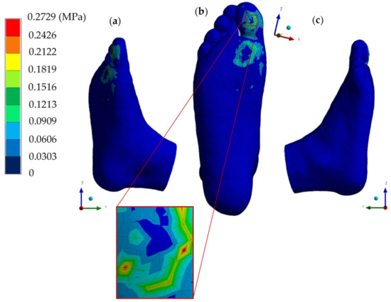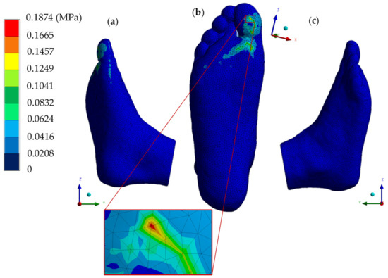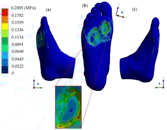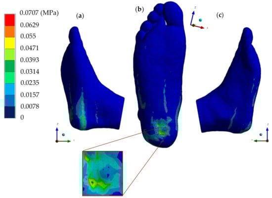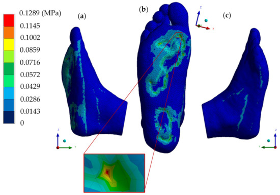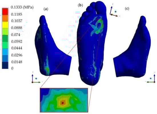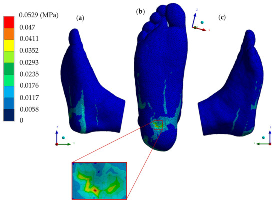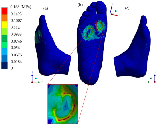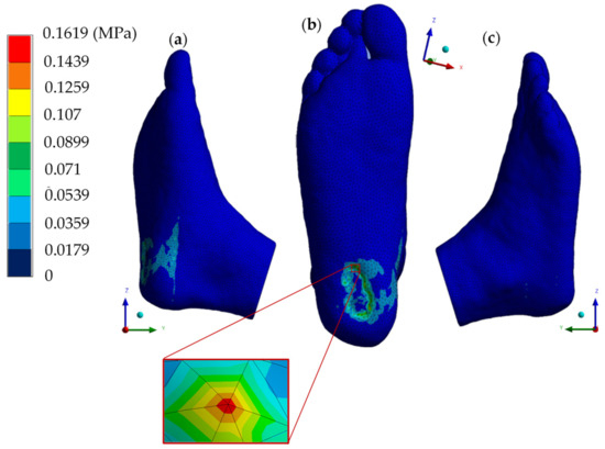 von Mises stress with patient-specific foot orthosis (L.R.). (a) Left side view. (b) Plantar region. (c) Right side view.