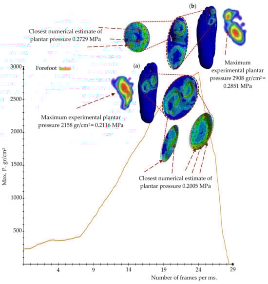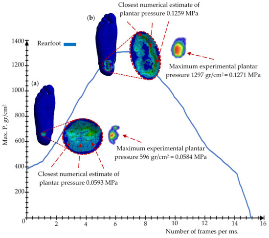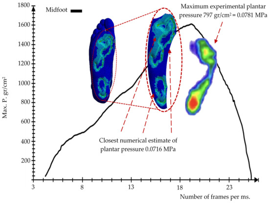 In the heel rise phase, the plantar pressure rose to 2158 gr/cm2, corresponding to 0.21162 MPa (frame 17). For the numerical analysis corresponding to this phase, a continuous section under the first metatarsal head was predicted and came closest to the experimental result with a value of 0.2005 MPa (Figure 16). Finally, the baropodometric result generated a plantar pressure of 2908 gr/cm2 for the pre-swing phase, equal to 0.28517 MPa (frame 25). The numerical simulation obtained values of 0.2729 MPa in the hallux areas, where, anatomically, there was a higher pressure concentration for this gait stance phase (Figure 16).